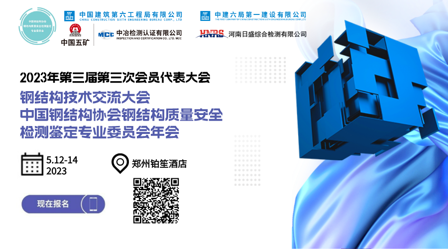 经协商,决定于2023年5月12日 -14 日,在郑州市举办钢结构技术交流大会、专业委员会年会。会议由中国钢结构协会钢结构质量安全检测鉴定专业委员会、中国建筑第六工程局有限公司、中冶检测认证有限公司主办,中建六局第一建设有限公司、河南日盛综合检测有限公司承办。请钢结构质量安全检测鉴定专业委员会各位副理事长、理事、会员、专业委员会各位专家务必拨冗准时参加会议,同时也盛情邀请钢结构工程界同行参加会议。