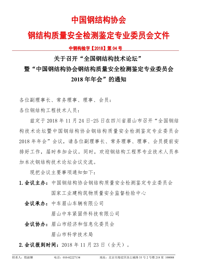 中钢构检字【2018】第04号-关于召开“全国钢结构技术高峰论坛暨中国钢结构协会钢结构质量安全检测鉴定专业委员会2018年年会”的通知